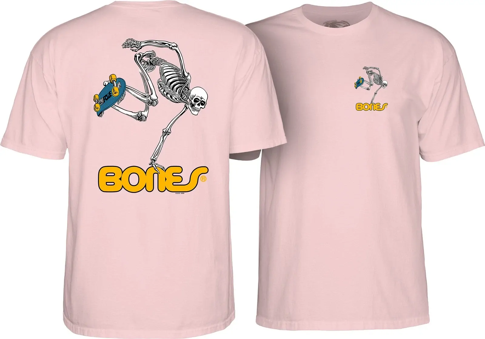 In 1977, artist VCJ illustrated two black-and-white posters to promote Bones wheels. About a year later, Court sat down to work on a new project that would turn that Bones theme into the concept of a skateboarding skeleton. To help Court make the image as realistic as possible, George bought a life-sized skeleton from a medical supply shop. Court named her Rosie. After several hours of propping and rigging, Rosie hung frozen in the position of a skateboarding skeleton. Court got to work. His piece, completed near the end of 1978, served as a Bones sticker and T-shirt graphic, the first illustration created under the new Powell Peralta brand.